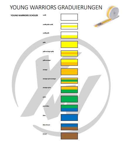 Im Young Warriors gibt es ein Gürtelsystem, angelehnt an klassische Kampfsportarten. Die Kinder können regelmäßig kleine motivierende Prüfungen machen und sich dann über ihre Trophäe freuen, den neuen Gürtel. Zu jeder Stufe gibt es ein festes Trainingsprogramm, das die Kinder an die Hand bekommen.